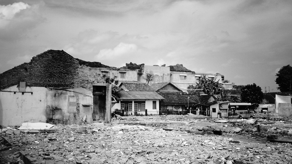 Digantikan oleh Suara palu bertalu membuka kaitan paku, suara lemparan material dari atap yang sudah tinggal rangka, dan teriakan para penghuni yang membongkar bangunan saling bersahutan. Satu per satu bangunan kios mulai roboh menyatu dan rata dengan tanah, satu fragmen hidup mulai menghilang.